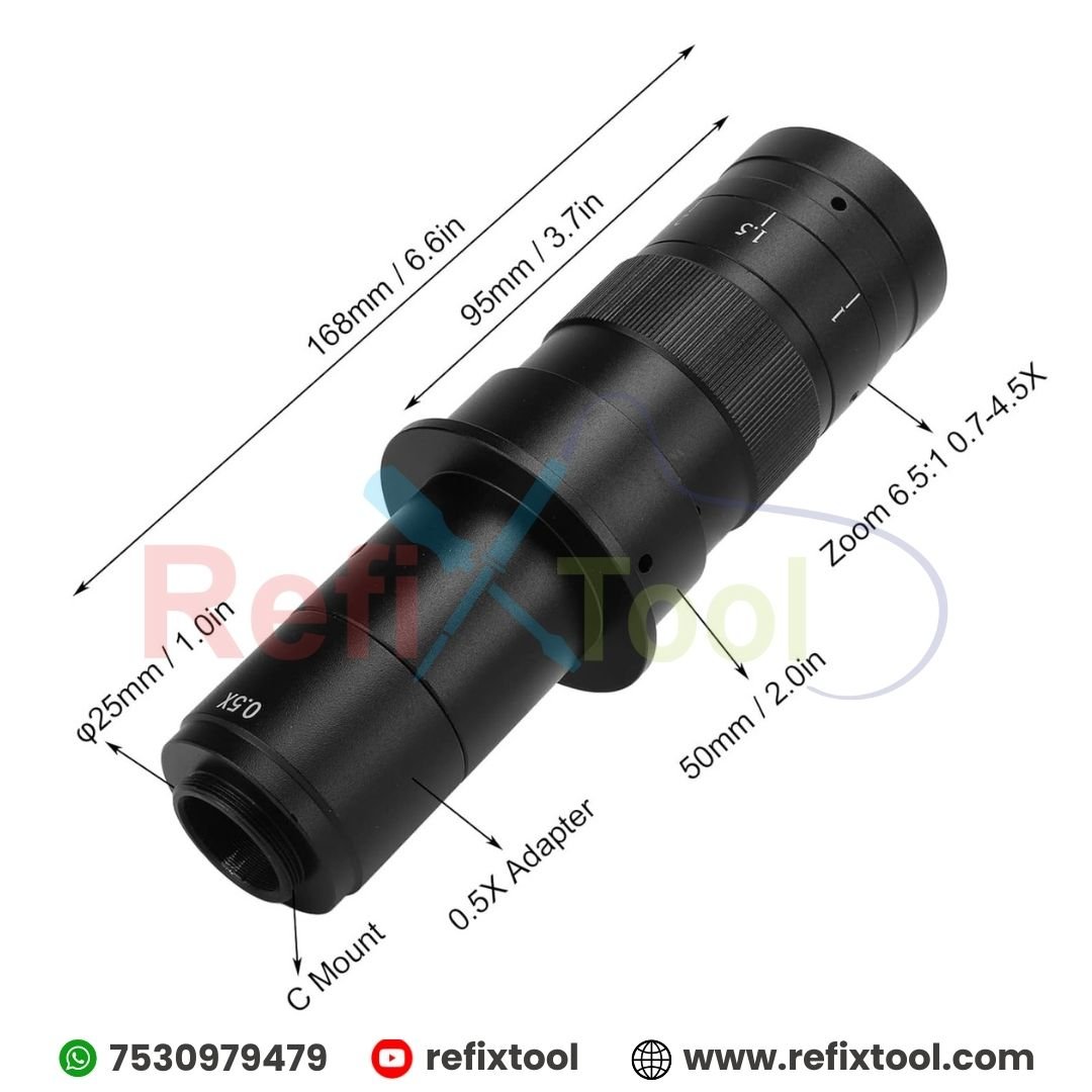 C-Mount Microscope Camera Lens 6.5:1 Zoom Up to 180X Magnification is designed for high-precision inspection and detailed observation in electronics repair, industrial analysis, and laboratory work. With a 6.5:1 zoom ratio and up to 180X magnification on screen, it delivers clear, high-definition images with excellent depth, making it ideal for PCB inspection, solder joint analysis, and fine component work.