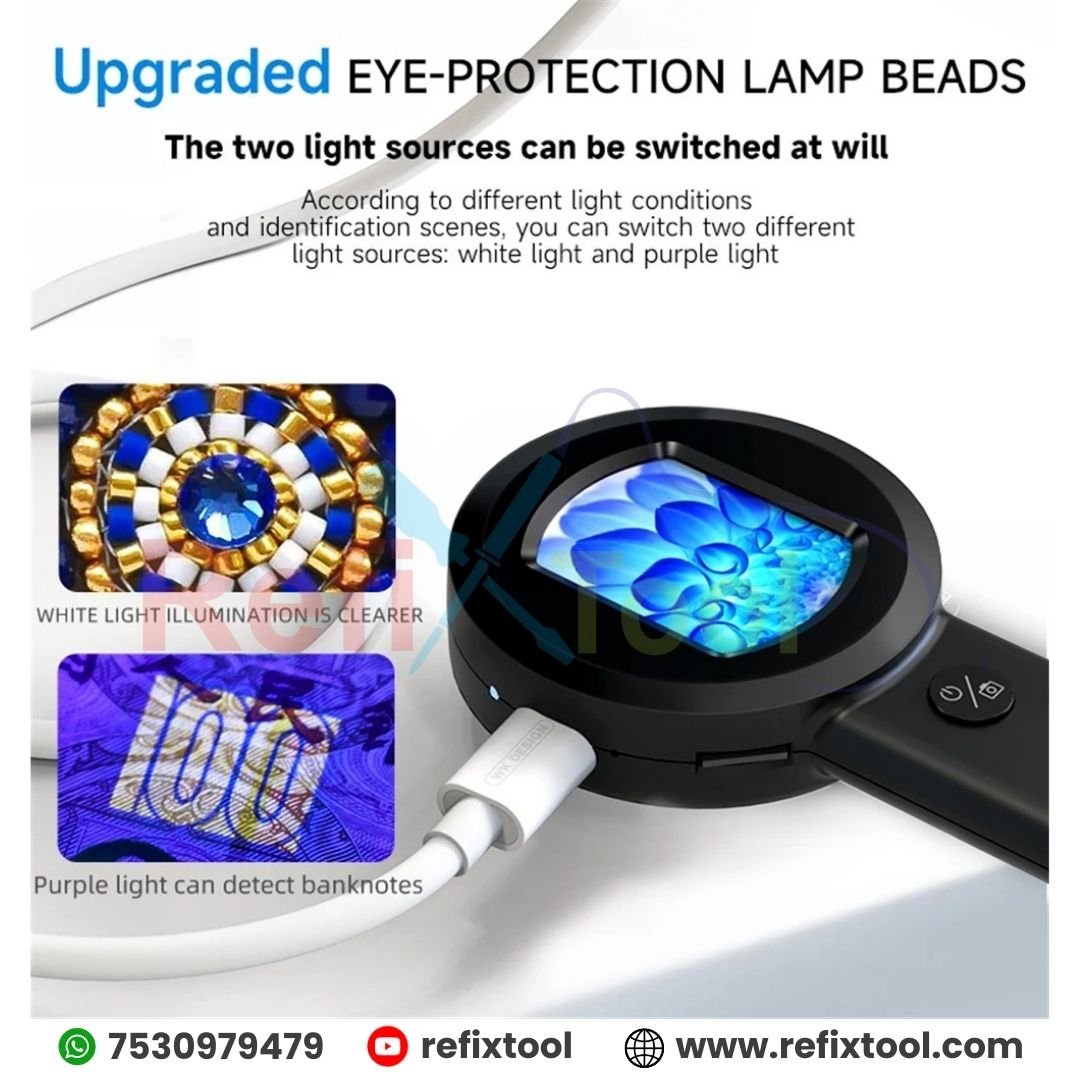Dual LED Lighting: Features 8 LEDs (4 white + 4 purple) with selectable lighting modes for different inspection environments, enhancing visibility and detail.