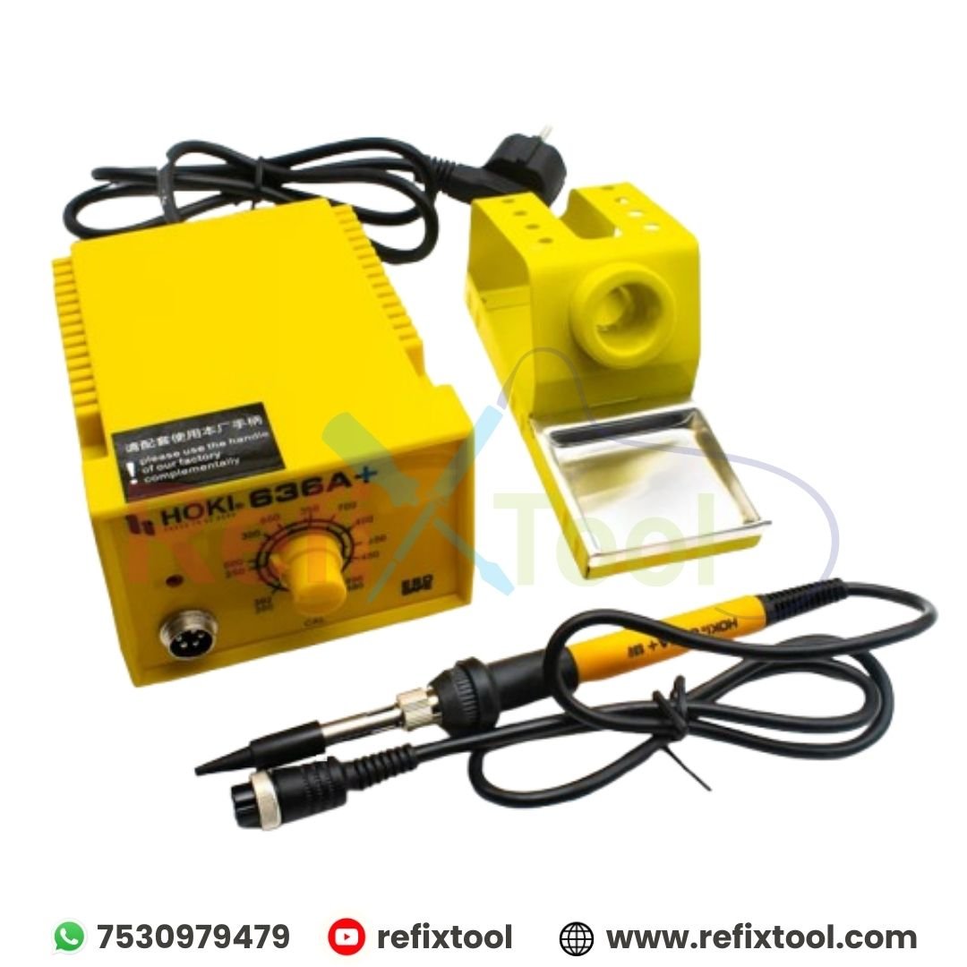 HOKI 636D+ 60W Temperature Controlled Electric Soldering Station Station is a durable and efficient solution for precise soldering tasks. Designed for professionals and hobbyists alike, it comes with a heavy-duty iron stand, a large iron rest, a round tip, and a cleaning sponge—everything you need for a complete soldering setup.