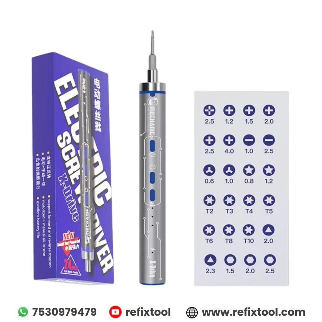 Mechanic X Drive Cordless Battery Operated Electric Screwdriver is a professional-grade precision tool designed for mobile phone repair, electronics, cameras, and other detailed applications. With its 500mAh high-density lithium battery, ergonomic design, and versatile bit set, it ensures efficiency, accuracy, and long-lasting performance.