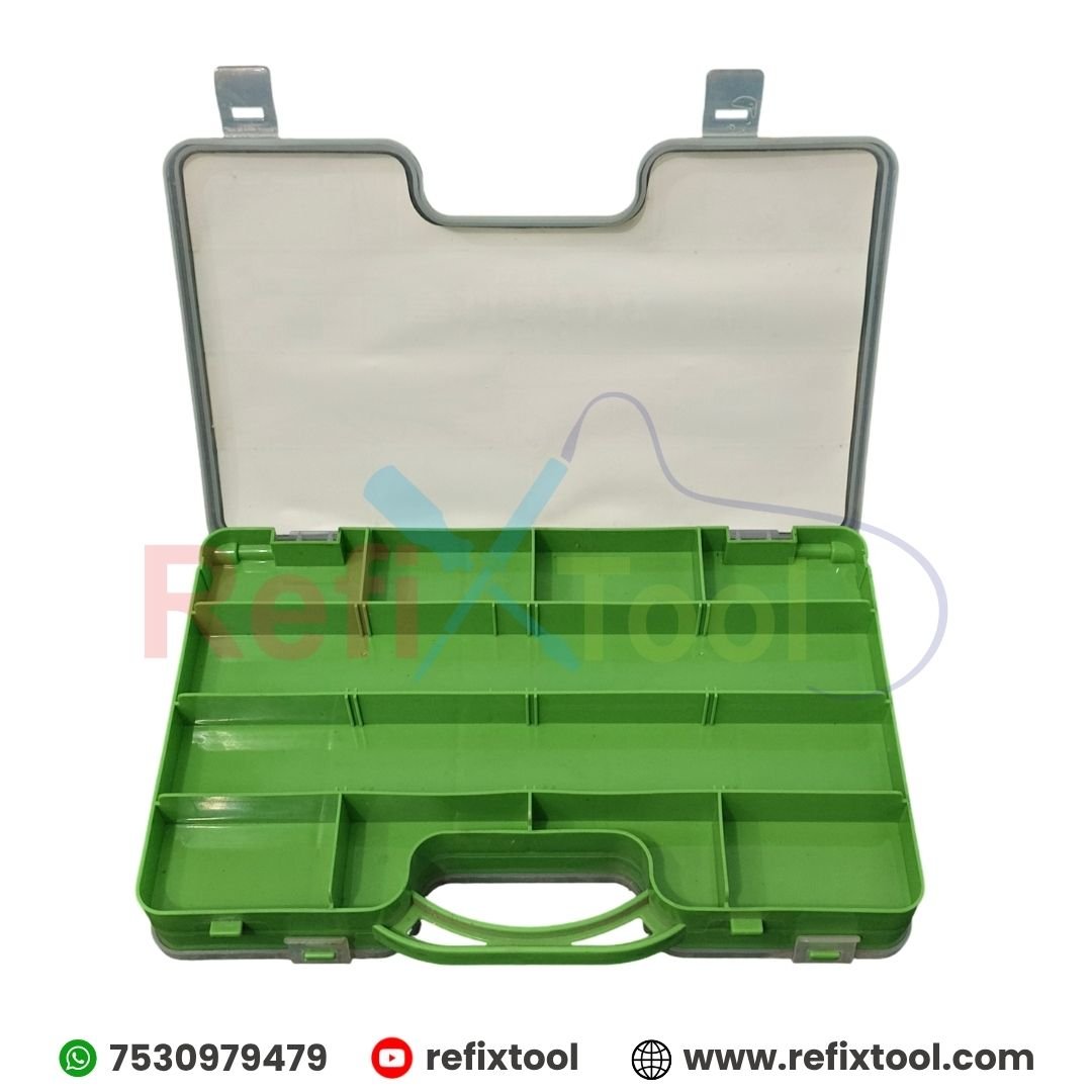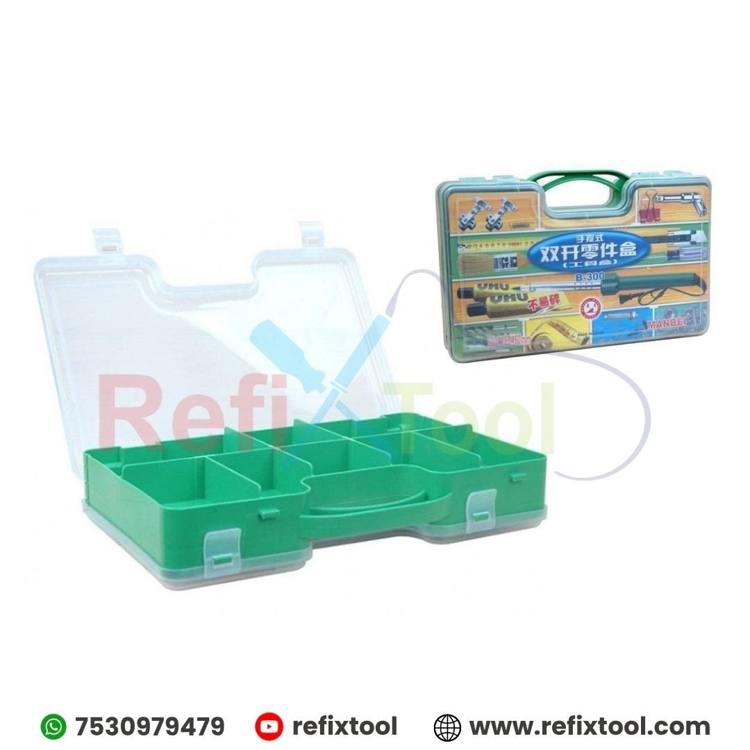 Portable Double Opening Parts Box (Model B-300) is a durable and spacious organizer designed for technicians, hobbyists, and DIY users. Built from high-quality plastic, this dual-sided box features 18 compartments with replaceable dividers, allowing flexible storage options. Ideal for keeping glue, soldering iron tips, bits, small components, brushes, screwdrivers, cutters, bolts, and more, it helps maintain a clean and organized workspace. The secure fasteners ensure that your tools and parts stay safely in place during transport.
