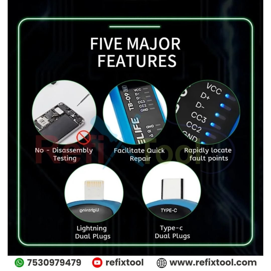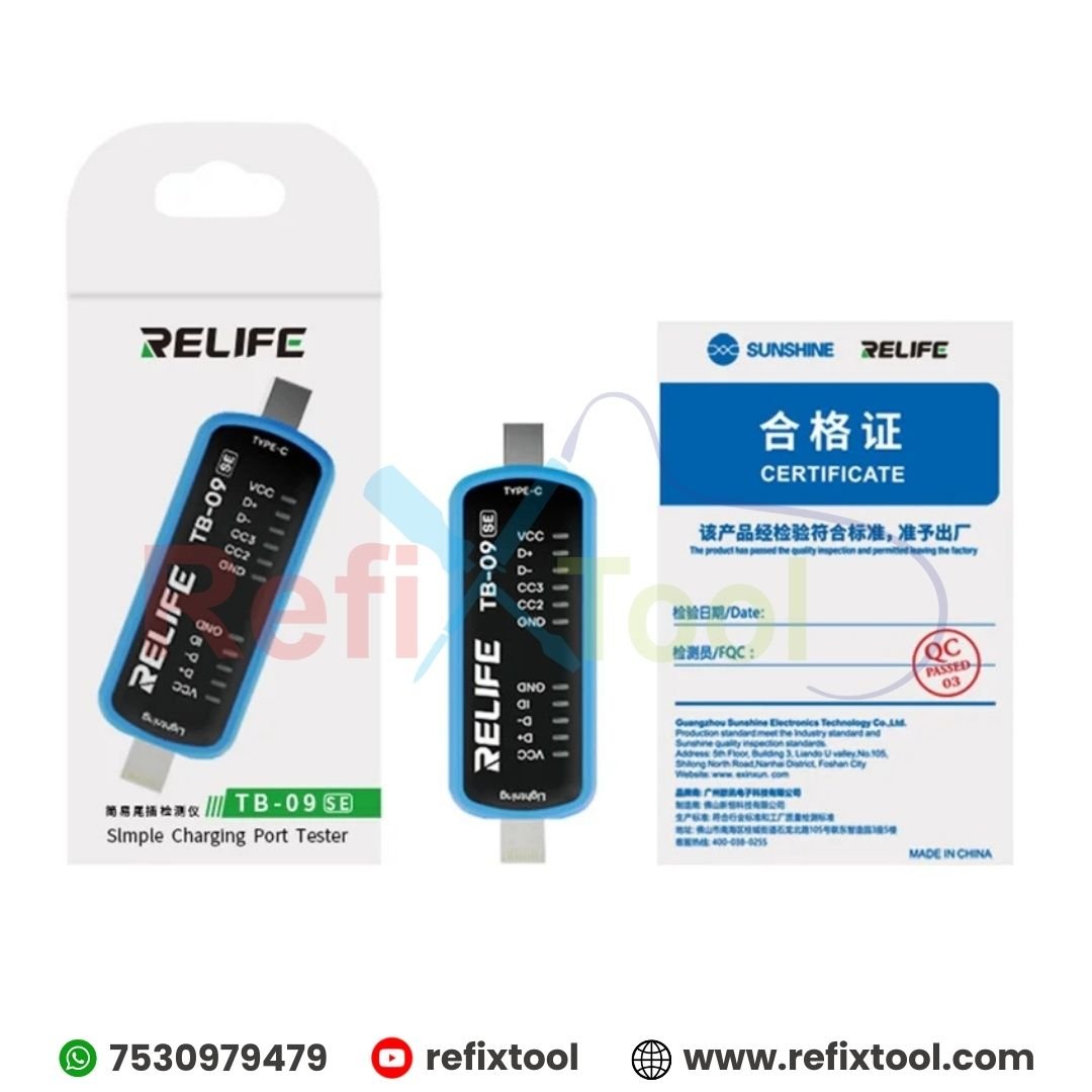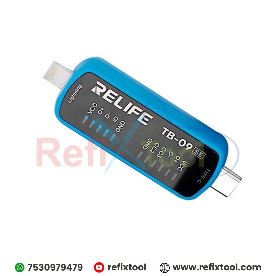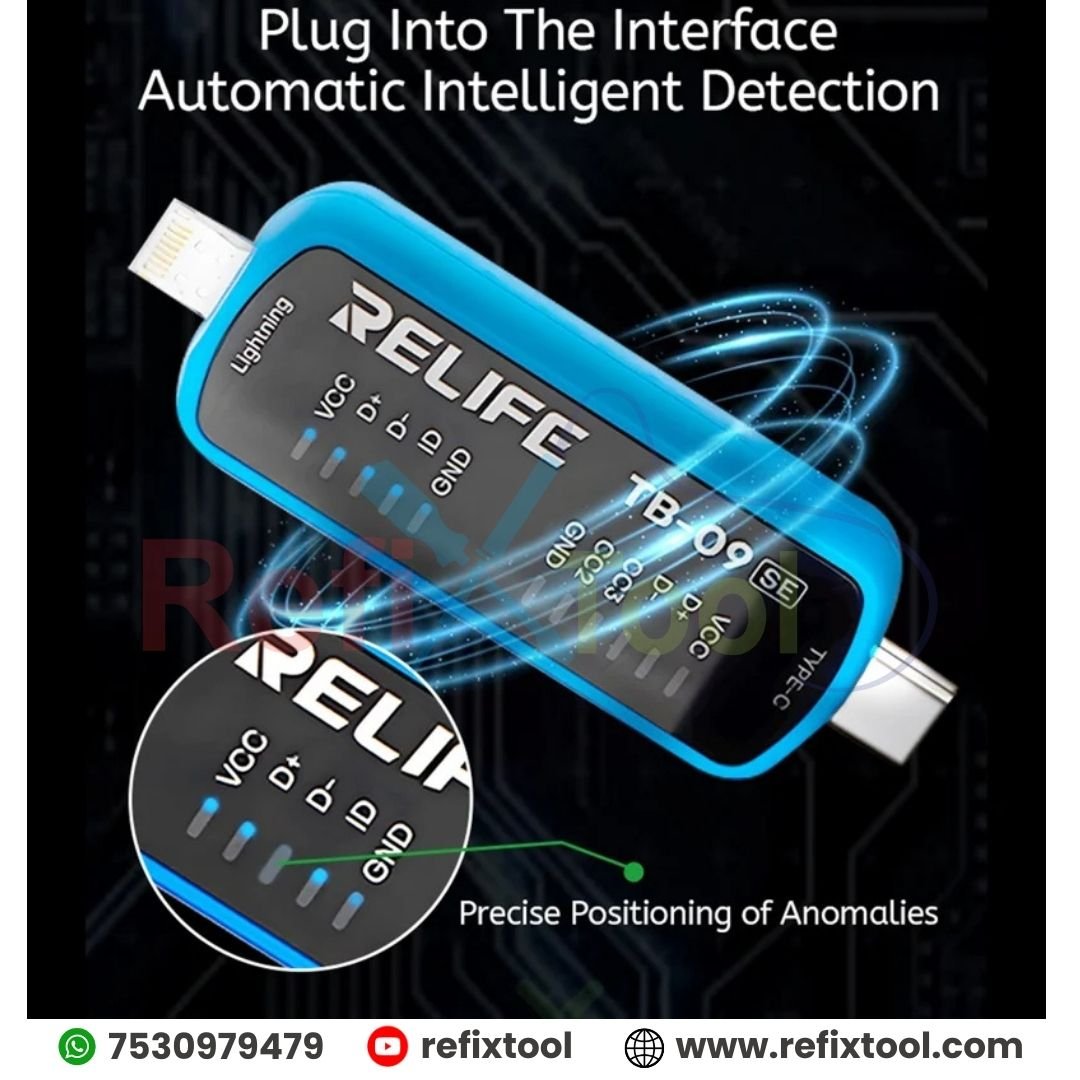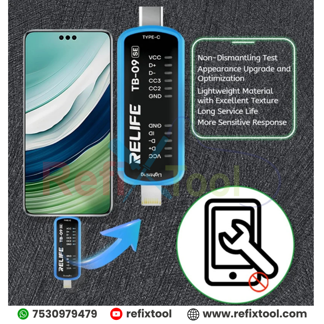 Relife TB-09 SE Charging Port Tester Type-C & Lightning designed to identify charging port faults in Android and iOS devices instantly. By using a simple plug-and-play method, it allows technicians to detect hardware issues without disassembling the phone, significantly reducing repair time and risk.