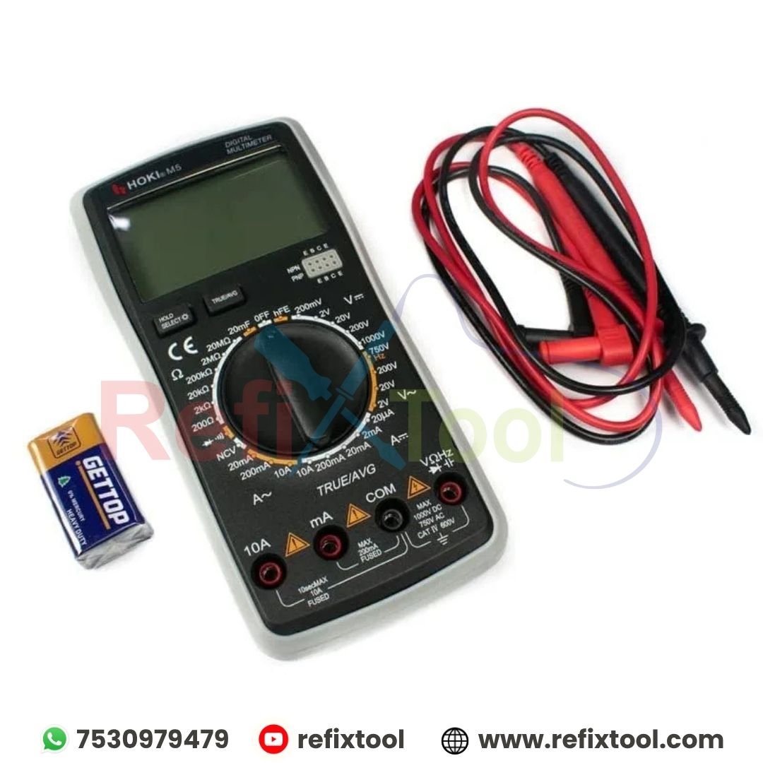 Hoki M5 Digital Multimeter with 2000 Display Count is a compact and reliable measuring instrument designed for electrical and electronic applications. It measures multiple parameters including voltage, current, resistance, capacitance, diode, and continuity, making it an essential tool for technicians, electricians, and hobbyists. With a 2000-count display and simple operation, it ensures accurate results in both fieldwork and lab testing.