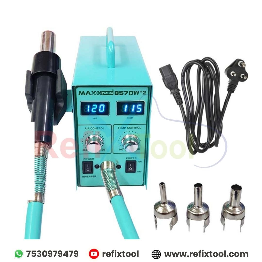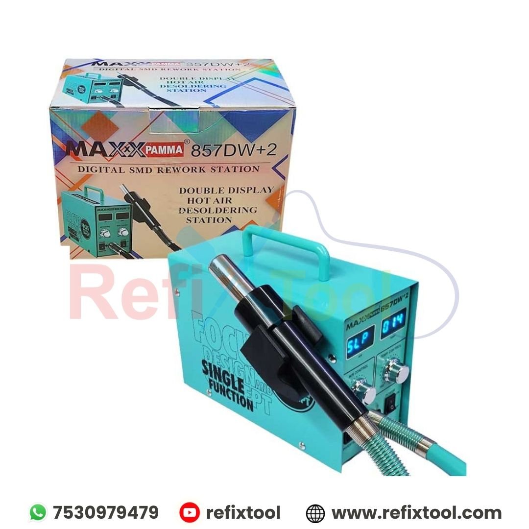 Maxx Pamma 857DW+2 SMD Rework Station is a high-performance tool engineered for precision soldering and efficient rework tasks. With robust power, precise temperature control, and versatile airflow, it’s ideal for electronics technicians, hobbyists, and professionals working on mobile phones, laptops, motherboards, and other PCB repairs.