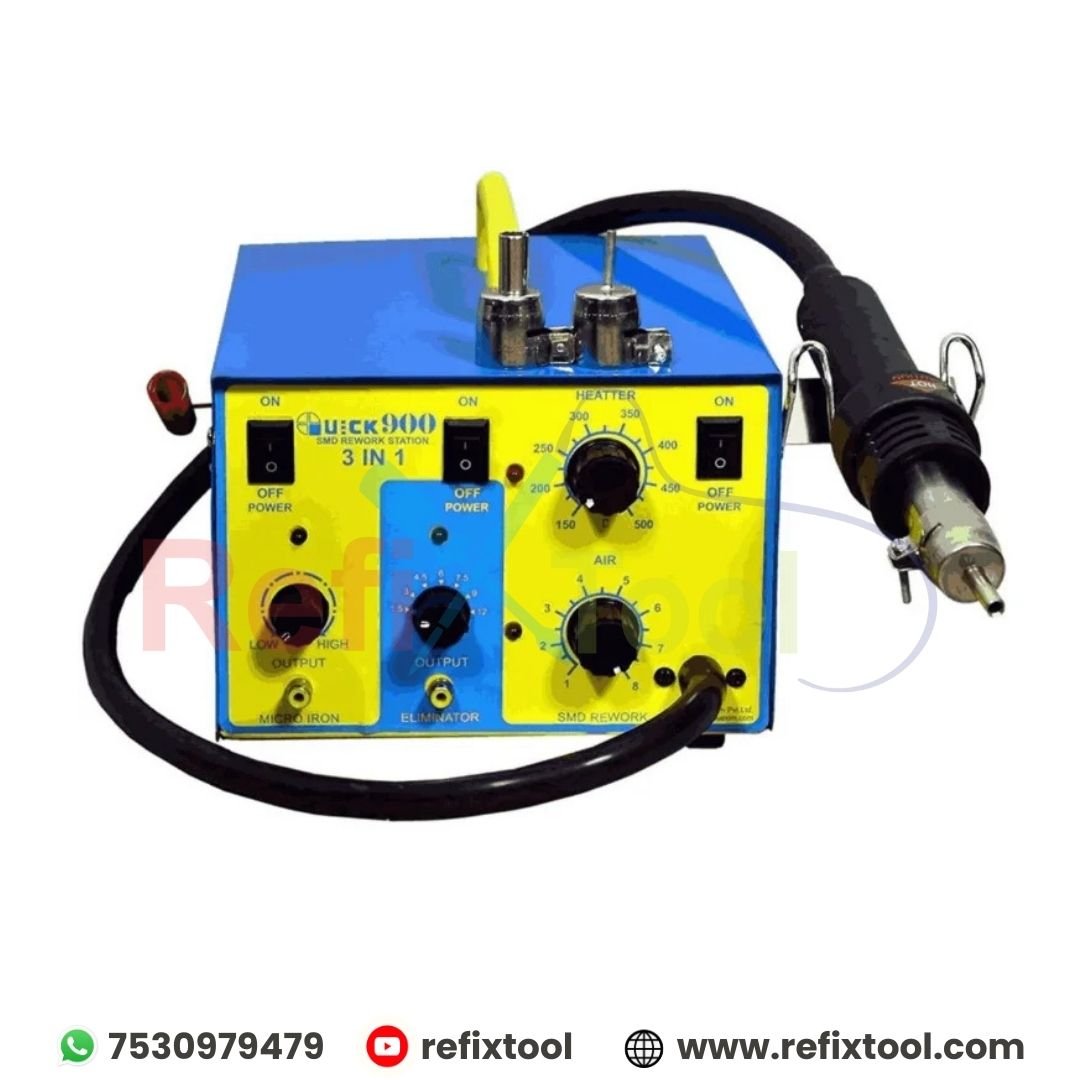 Quick SMD Rework Station 900 3-in-1 Rework Station with 12w Mini Iron is a professional-grade solution for soldering, desoldering, and reworking a wide variety of electronic components. Designed for precision and efficiency, this station is ideal for repairing mobile screen covers, BGA components, SMD chips, and other surface-mounted devices.