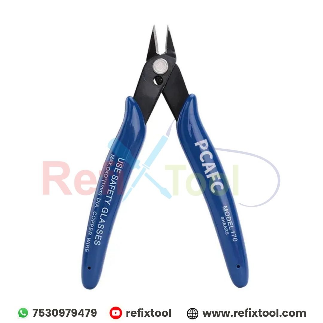 Shear Cutter Electronic Diagonal Pliers Model-170 is a precision cutting tool designed for small and delicate materials. Constructed from corrosion-resistant stainless steel, it provides durability and long-lasting performance. The sharp pivoting blades allow for precise cuts, making it ideal for electronics work.