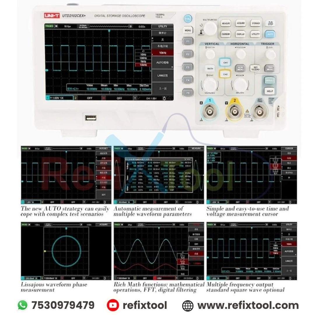 UNI-T UTD2102CEX+ is a dual-channel, 100MHz digital storage oscilloscope designed for accurate signal analysis in research, education, and electronics testing. With a 1GS/s real-time sampling rate, 64kpts memory depth, and ≥5000 wfms/s waveform acquisition rate, it offers precise waveform capture even for random and low-probability events.